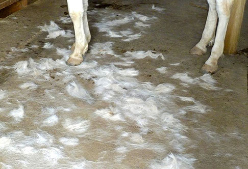 25.08.2015: Die Wallache im südlichen Offenstall haben eine neuen Boden bekommen: Waldboden-Häcksel!