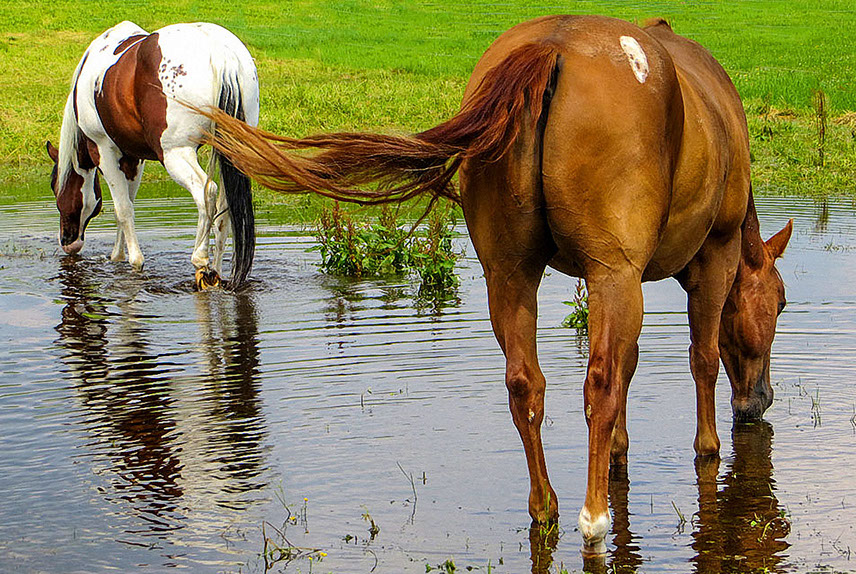 16.06.2015: Auch in diesem Jahr verwandelt der Dauerregen so manche Weide in ein Pferde-Plaschbecken … ••> Vergrößerte Ansicht bei Klick aufs Bild