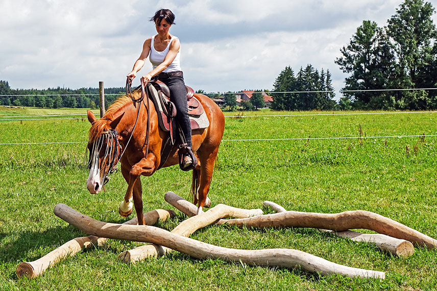 Ein Anfang ist gemacht, die ersten Hindernisse stehen: Petra, Barbara, Hexe und Nala beim Premierenritt! •> Vergrößerung bei Klick aufs Bild!