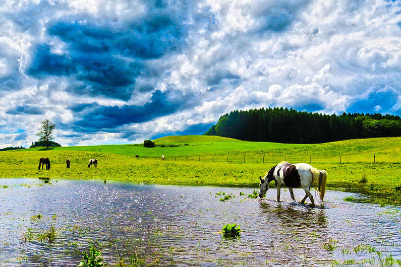 18.05.2016: … alle Jahre wieder: Heftiger Dauerregen und überschwemmte Koppeln. Doch auch das hat manchmal seinen Reiz … (Foto: Ingrid Merk)